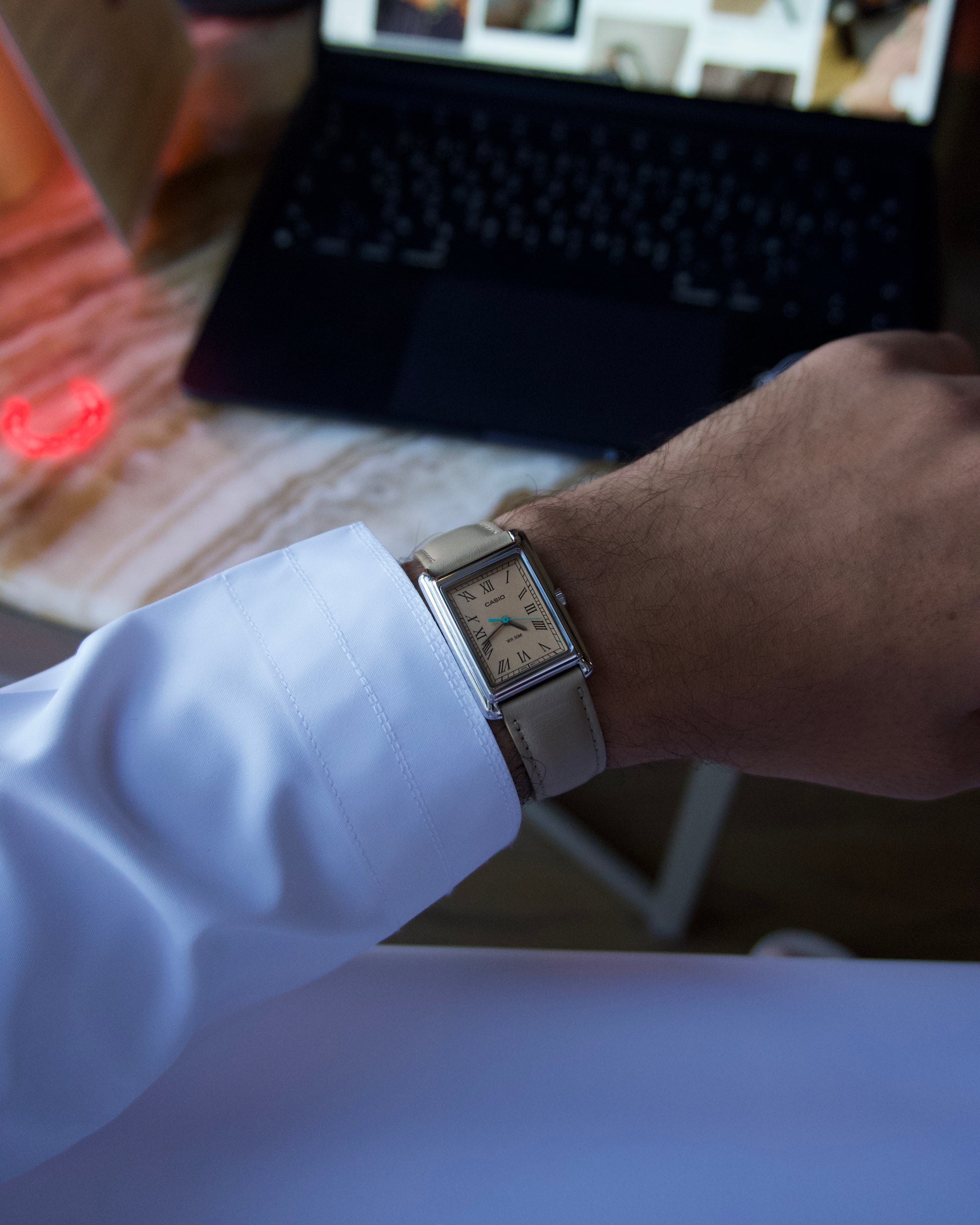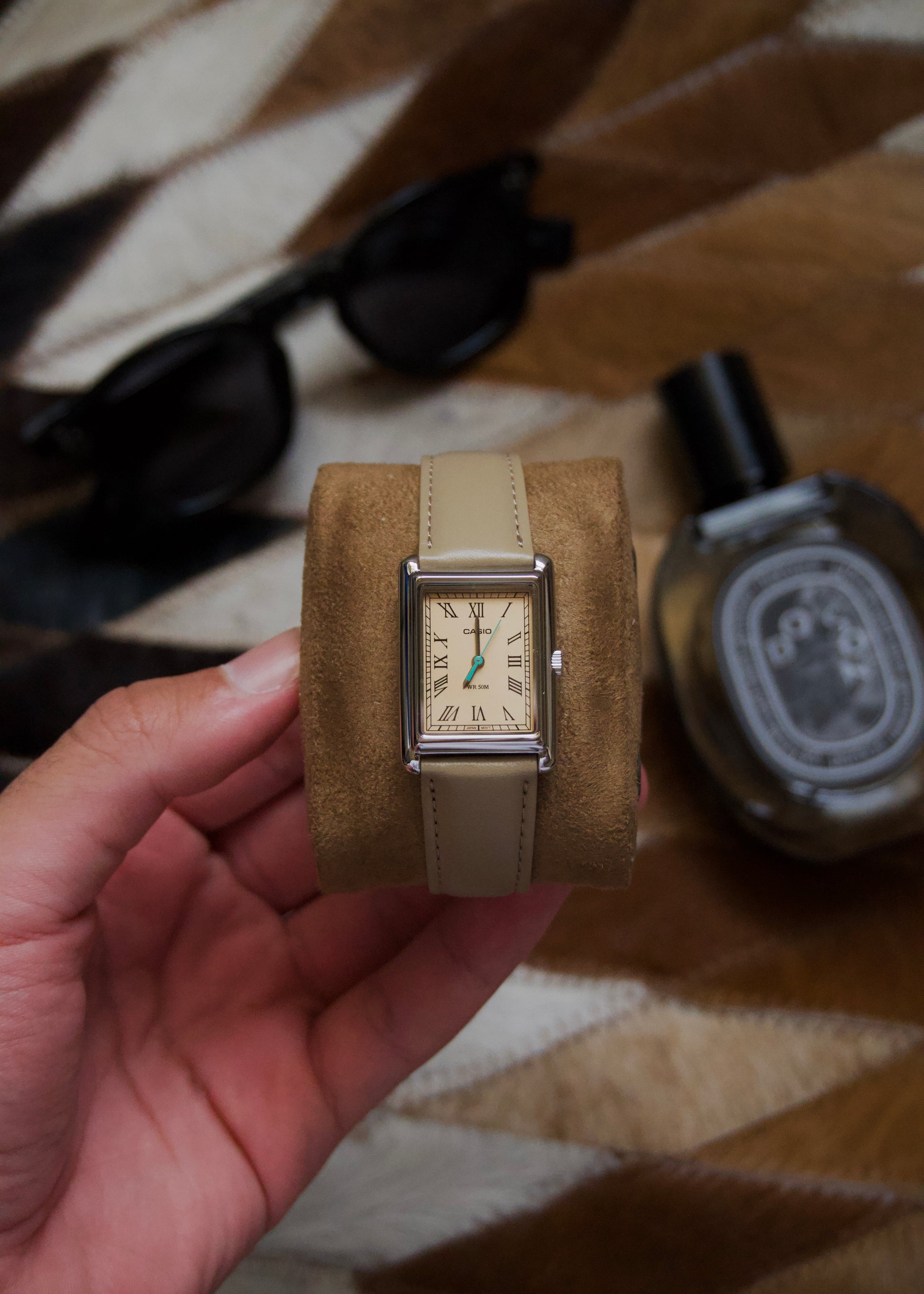 Casio LTP-B165L-5BVEF – Brand new, never used, direct from Casio. Elegant square silver case, light brown dial with Roman numerals, and beige leather strap.